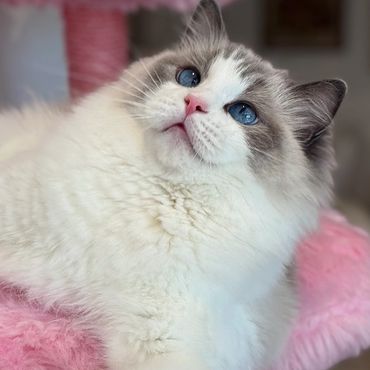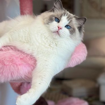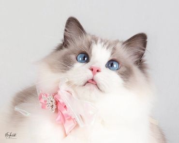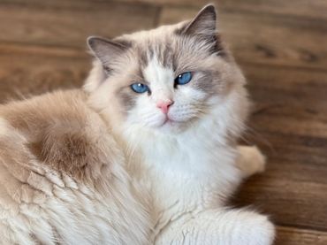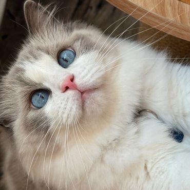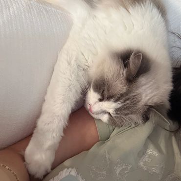 She’s everything I could ever want in a Ragdoll, affectionate, chatty, super floppy and endlessly snuggly. She's so over the top she acts like she's drunk with love nestling up against our faces! A few of her kittens have done the same!