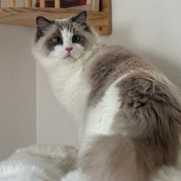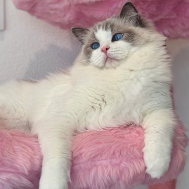 Bella is the ultimate lap cat and my Queen Bee! She’s a Blue Bicolor beauty with a fluffy, non matting coat and big, derpy blue eyes. Weighing around 10 pounds, Bella is thick girlie and has so much personality.