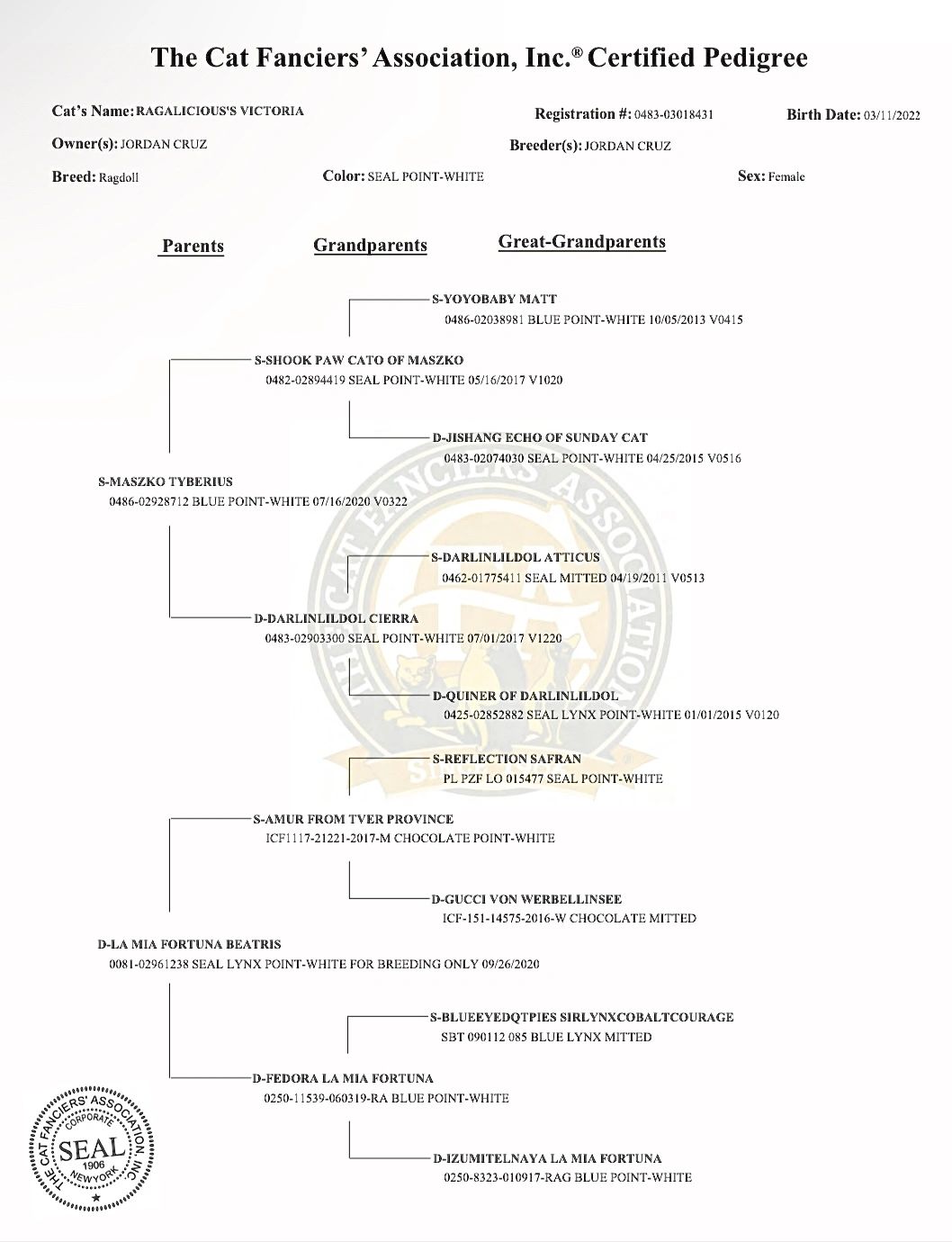 She’s incredibly patient and easy to handle, making her a joy to have in my cattery. Victoria is by far my foundation queen, with some of my best, well-rounded lines in terms of health, coat quality, and those mega-snuggly personalities that Ragdoll lovers adore!